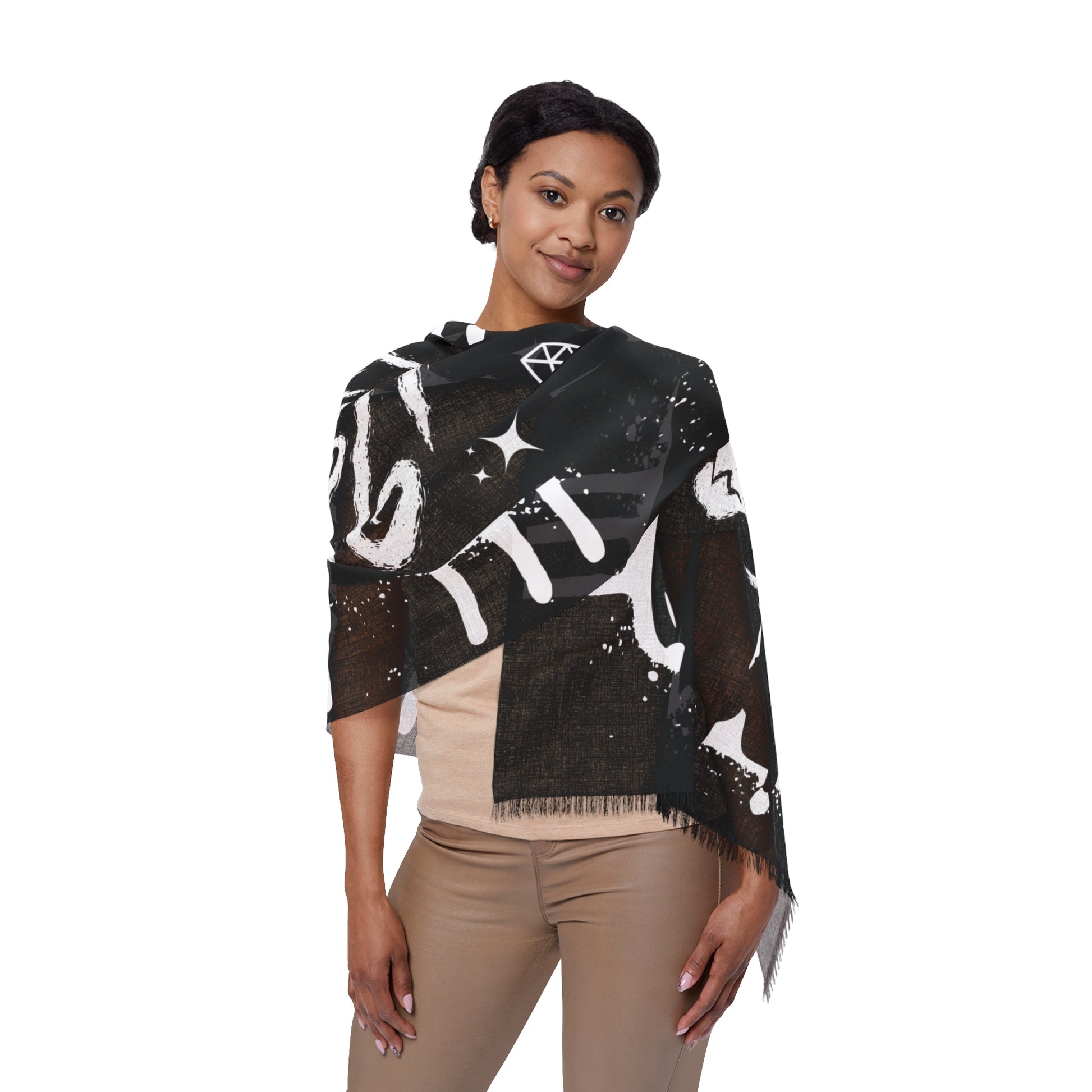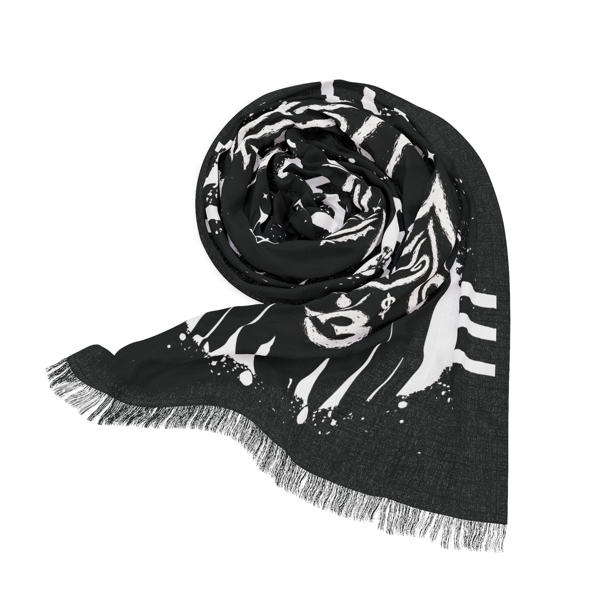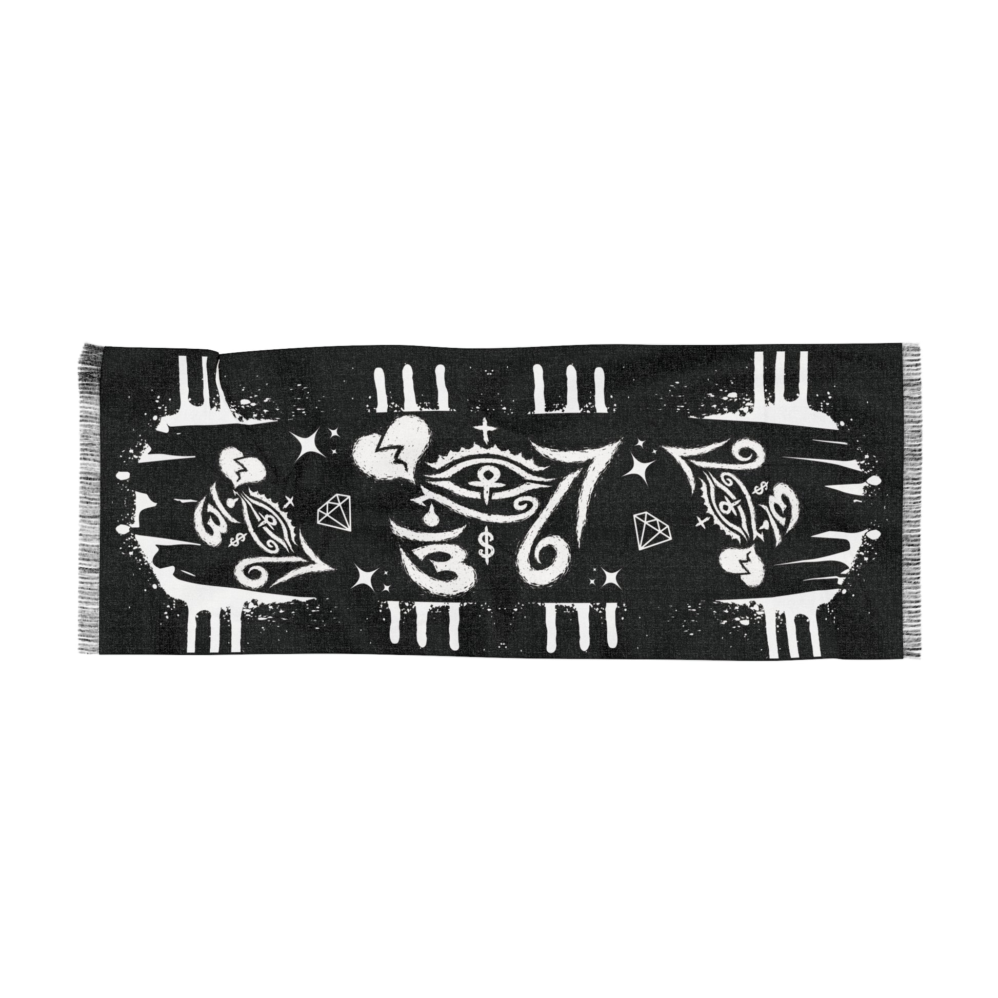 A lightweight, artful scarf that reads like a midnight talisman. Woven from resilient polyester with a soft hand, it drapes easily over shoulders or around the neck, letting the high-contrast, symbolic motif take center stage. The design—hand-drawn eyes, hearts, stars and floral swirls—feels both vintage and slightly occult, lending a moody, expressive layer to streetwear, layered looks, or festival outfits. Because the print is lively yet semi-translucent, the scarf carries a whisper of texture when it moves, catching light and conversation without weighing you down. Wear it as a headwrap, neckerchief, or belt sash to bring a subtle, enigmatic edge to evening walks, late-night shows, or creative gatherings.